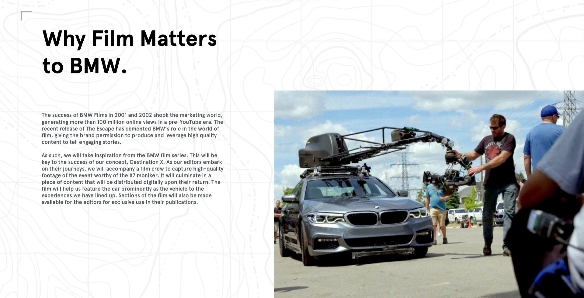 We seeded the idea of the value of filmic content in activations. Reinforcing BMW’s storied history of films in the past and using that to create filmic assets that can give editors a plethora of assets to write about.