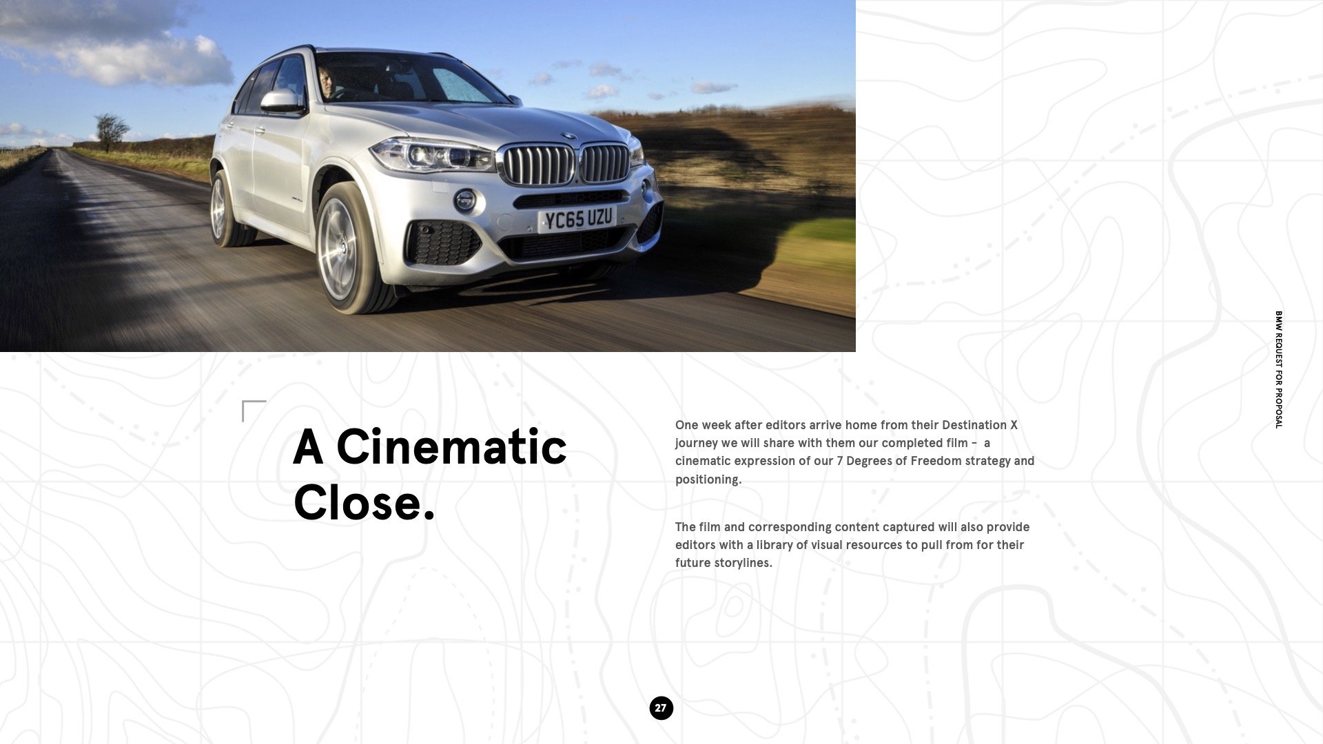I was pulled in by United Entertainment Group (UEG) to lead creative on a pitch for BMW Group's Rolls Royce brand. The success of that pitch led to the agency retaining me and an opportunity to pitch for larger business with BMW Group—specifically, national press events for BMW.